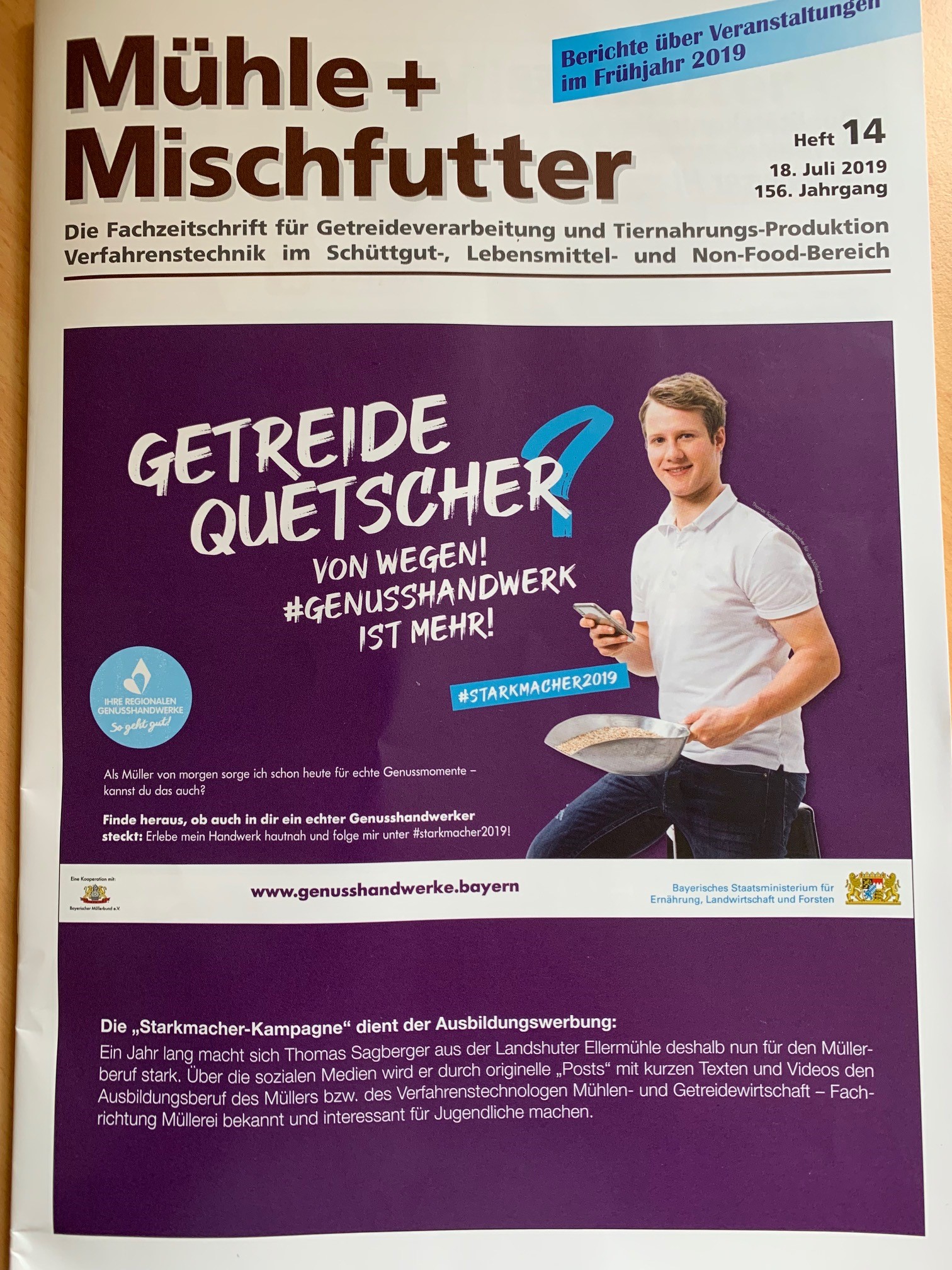 Ermöglicht hat dies Herr Rainald Pottebaum von der Zeitschrift Mühle + Mischfutter. Wir möchten ihm hier an dieser Stelle dafür ein herzliches Dankeschön aussprechen! Falls Sie die Ausgabe selbst nicht gesehen haben, haben wir das Titelblatt mit unserem Starkmacher Thomas Sagberger, wie es auf der letzten Mühle + Mischfutter-Ausgabe zu sehen war, für Sie abgebildet:
